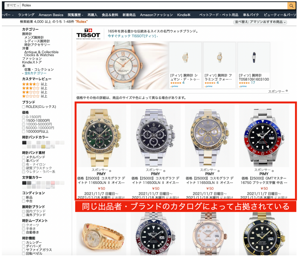 Amazonのスポンサー広告の本来のアルゴリズムは、不正競争が発生しないように気をつけて作られている。 1ページ目の上位に対し、一つの販売者が独占的に表示してしまう事を避ける動きがある。 上記のように一つのブランドによってスポンサー広告が上位を独占する事は、本来のアルゴリズムとは異なっており、操作可能な不正プログラムが仕組まれている危険性があると言える。