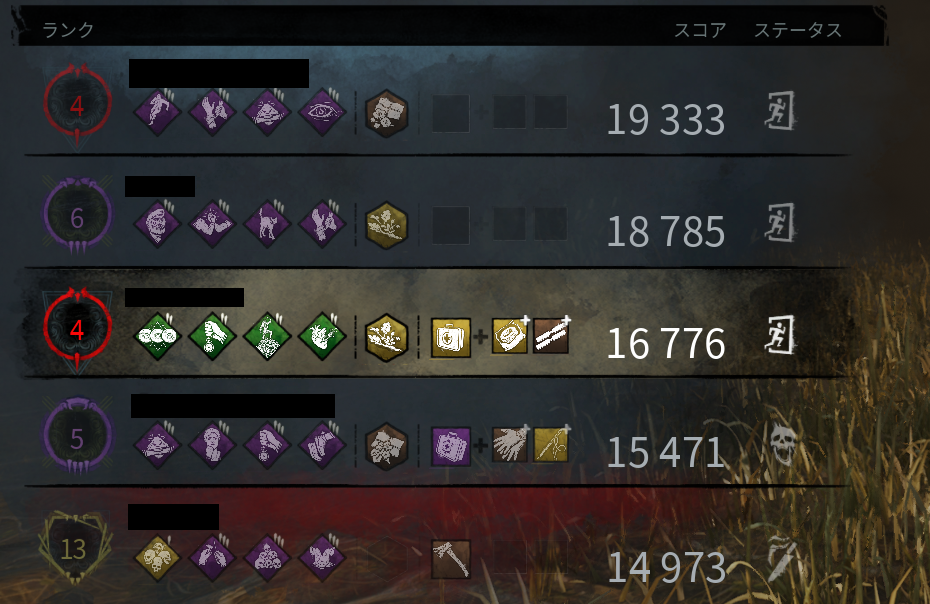 これも赤帯になるほどの上級者故なのか、キラーの攻撃当たってるはずなのに、すり抜けてセルフケアで回復し続けるサバイバーもいます。