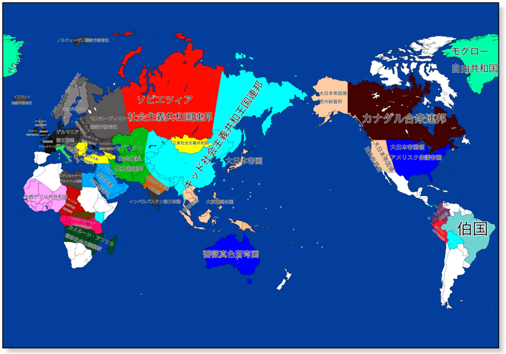 こちら最新の世界地図です!大きく変わったところはラ・ウェールズ共和国とパナーマフ・キッド社会主義共和王国、大日本帝国と大東亜連合国に陸上の国境ができた所でしょうか。