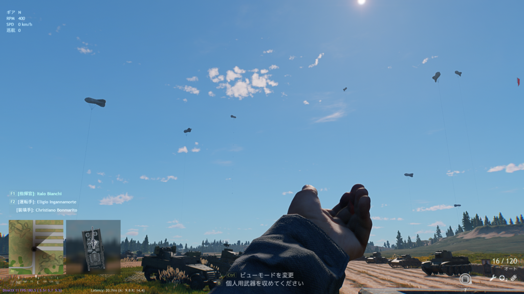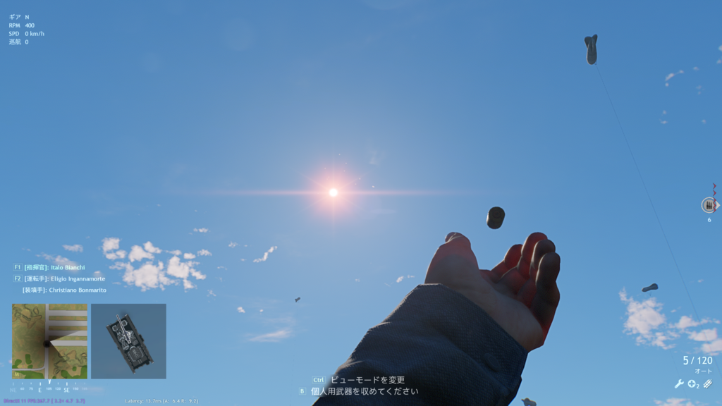 セモベンテで車外偵察モードにする→携行武器を出す→出したまま一旦車内に戻ってもう一回車外偵察にする→武器のテクスチャが消えるというどうでもいいバグ。他プレイヤーからも消えてるように見えるかは知らん