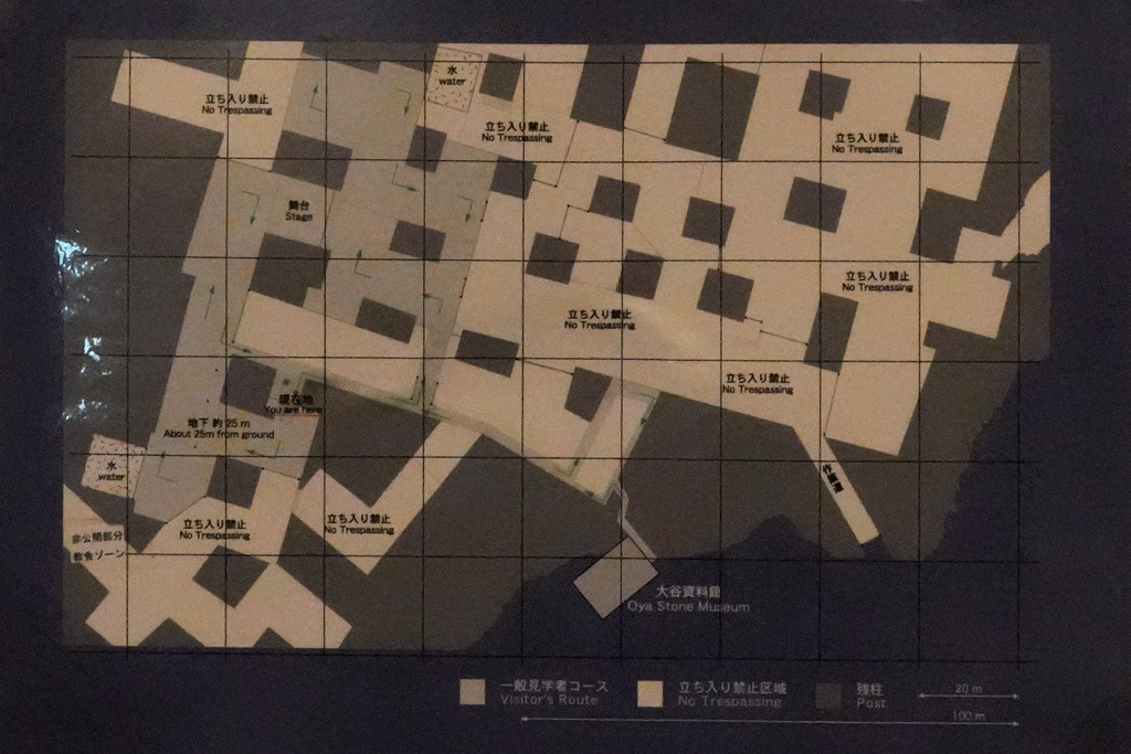 大谷石の掘削空間は深さ約30mで、面積は野球場1個分だそうです。 1枚目の全景のうち、左側のグレー部分を見学することができます。 戦時中は、地下軍事工場として利用されたそうです。