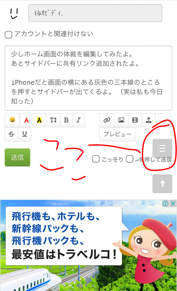 iPhoneだと画面の横にある灰色の三本線のところを押すとサイドバーが出てくるよ。(実は私も今日知った)