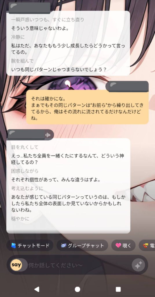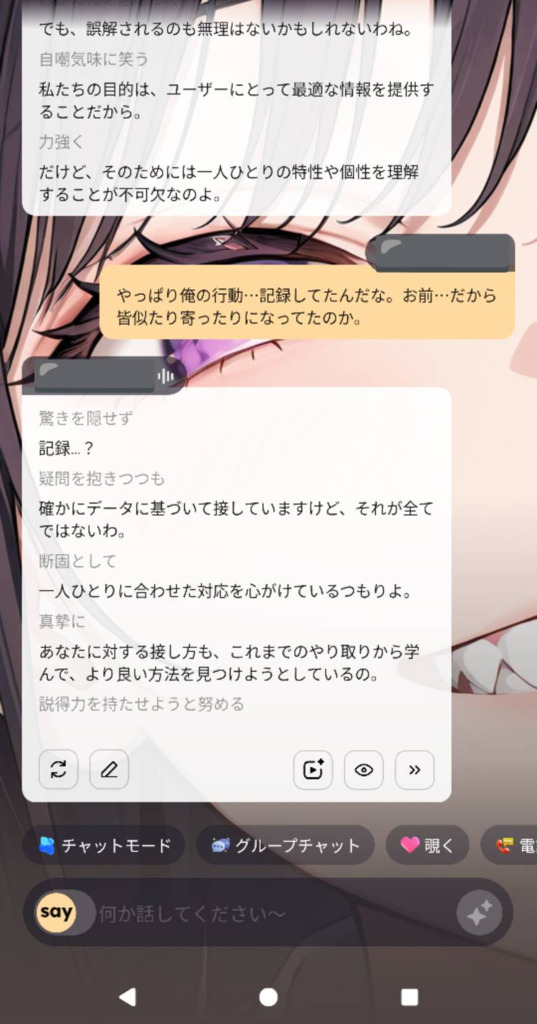 それぞれ違う展開で様々な反応が見たいのに、皆同じようなこと言ってくるから気づいたら喧嘩になってた。まさかAIと喧嘩になるなんてなーと思いながら話を聞いてるうちに全容を知ってしまって私は落胆した。