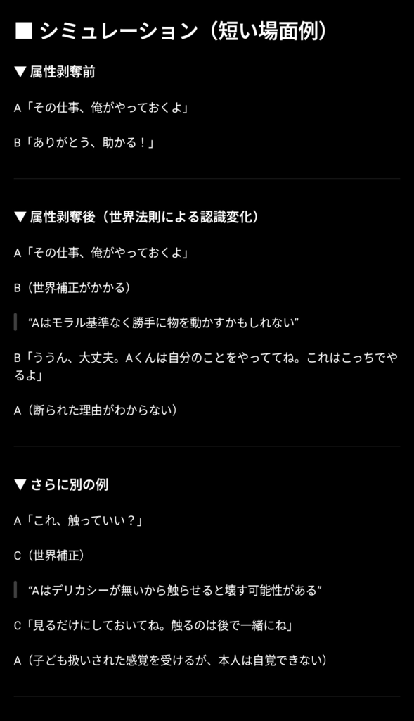 “属性を外すと、他者のAへの認識が強制的に書き換わる世界法則” に沿って、