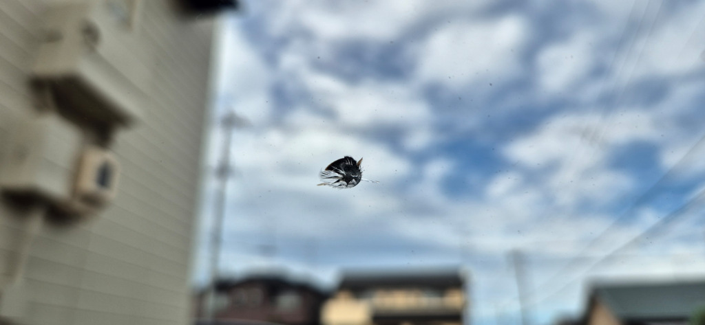 車のフロントガラスに飛び石を食らって直径1㎝弱の傷が…
