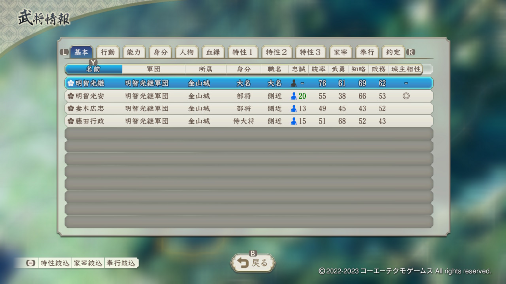 今回の信長の野望のバロメーターは統率・武勇・知略・政務の4種類だから。