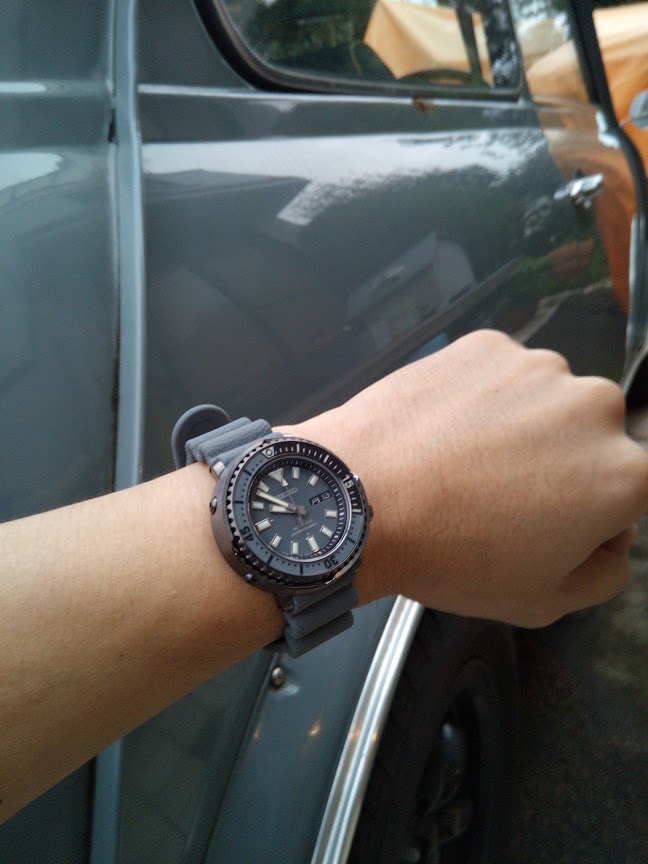 無事戻ってきて良かったですね。 おおっ! 本当にミニのボディカラーに似ていますね。グレーって微妙な色で、同じように見えても近くに持ってくるとイメージが違う場合がよくあります。これは凄くマッチしていると思います。カッコいいっす! ミニの世界はよく分かりませんが、スミスなどの英国時計を合わせるのが定番なのでしょうか。そこにあえてセイコー。しかも外胴ダイバーズを合わせちゃうのがイカしてます。