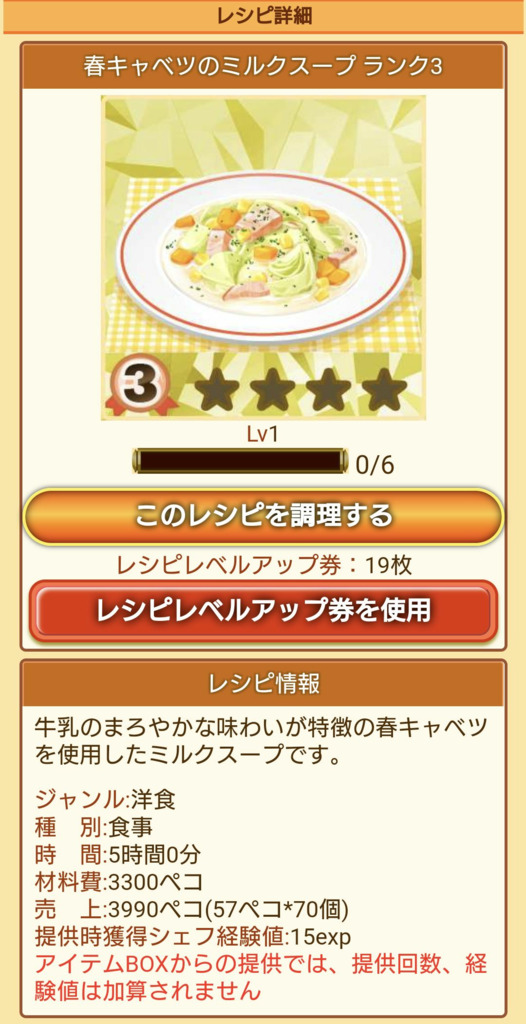 なので本当はこういうことを書きたくないのですが「何かありましたら教えてください」とのことなので、参考までに書かせていただくと、どのレシピも共通してレベル2の情報が一番入手しづらく、一番時間がかかっています。 アプリパックやガチャ(HappyBox含む)、レシピチャレンジのご褒美などはレシピ詳細を見れるようになっていて初期ステータスが見れるので、そういうレシピはレベル1の情報が入手できます。 ですが、フロア提供時の経験値だけは持っている方の画像からしか見れないので、どのレベルでも画像提供はありがたいです♪ スタッフイベントや美食王イベントのご褒美は初期ステータスが見れないので、特に後半のご褒美レシピはレベル1もありがたいです。 情報入手の難しさでトップクラスなのはゴッドショップのレシピと、招待ノートで手に入るレシピです。 このふたつはそもそも入手している人も少なく、レベルに関係なく情報収集が難しいです。