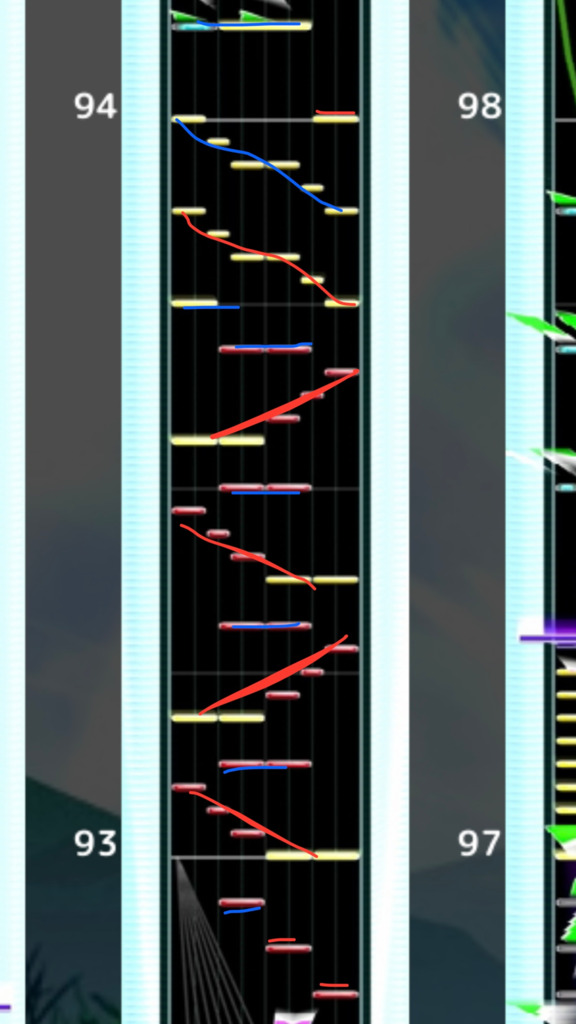 オンゲキ配置の流用だから全然違和感なかったけど、よく見ると結構不思議な配置が多い ドロップの謎の位置にある片手3連階段とか