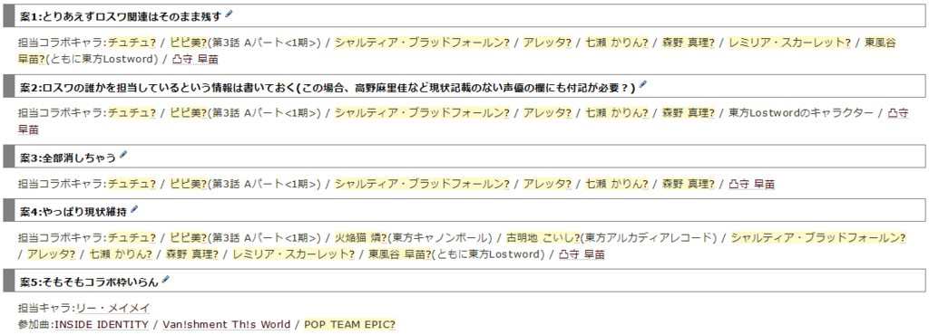 異論が出なかったので編集しようと思い東方LostWordについて改めて調べてみた所、「どの声優が参加しているか」の情報はあっても「どのキャラクターを担当しているか」の確定情報がないことが分かりました。 そこで、画像の案のうちどれを採用すべきか、あるいは別の方法を取るべきかの意見をお願いします。