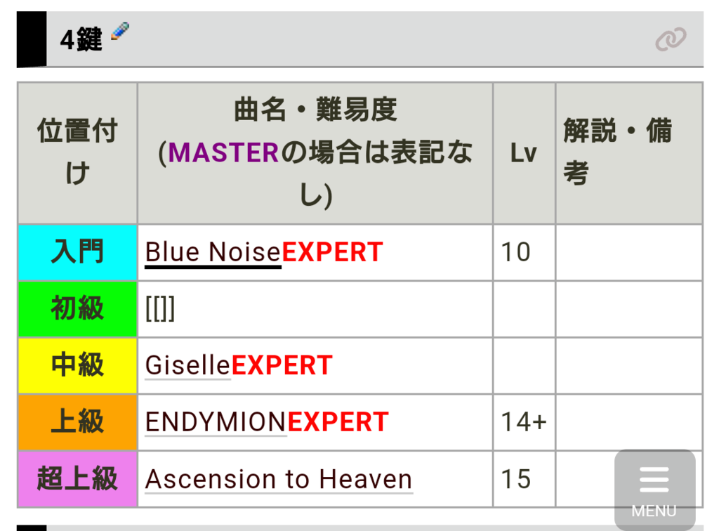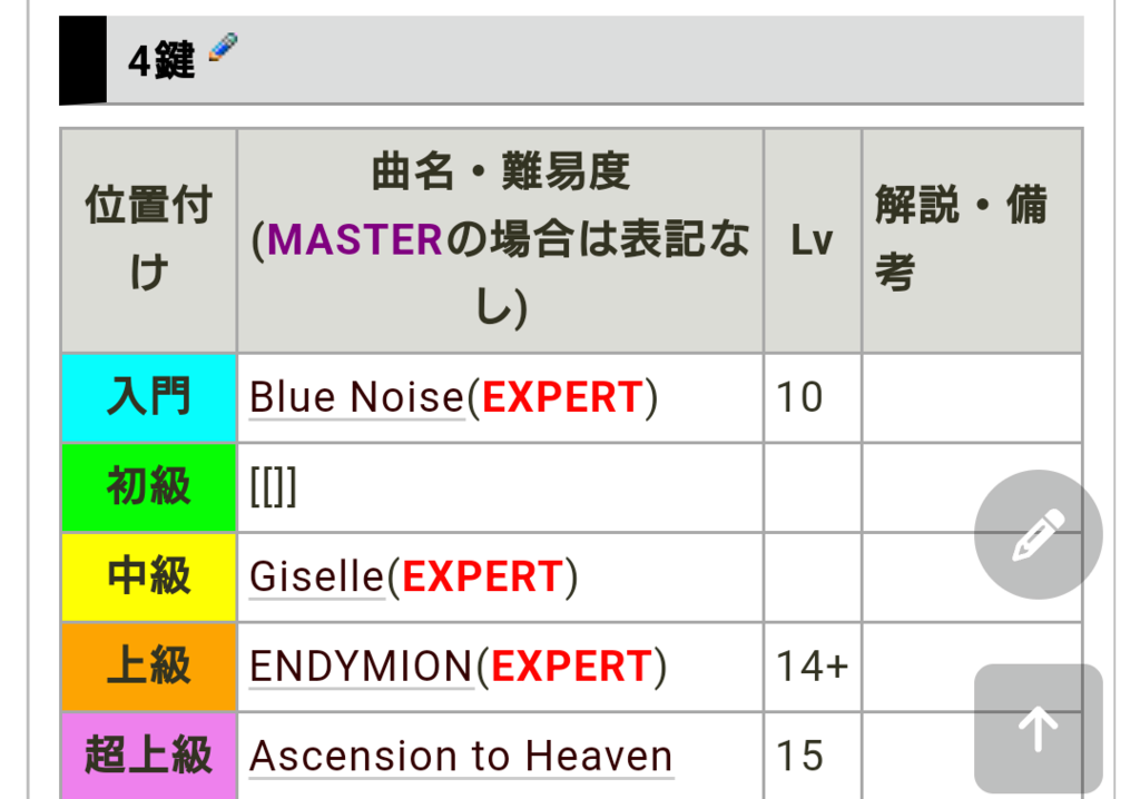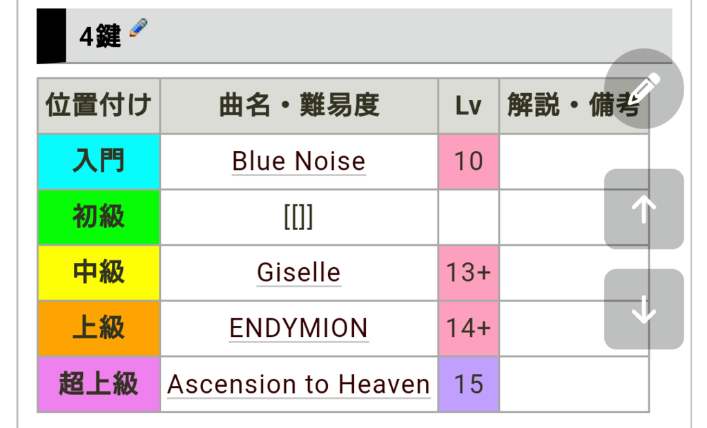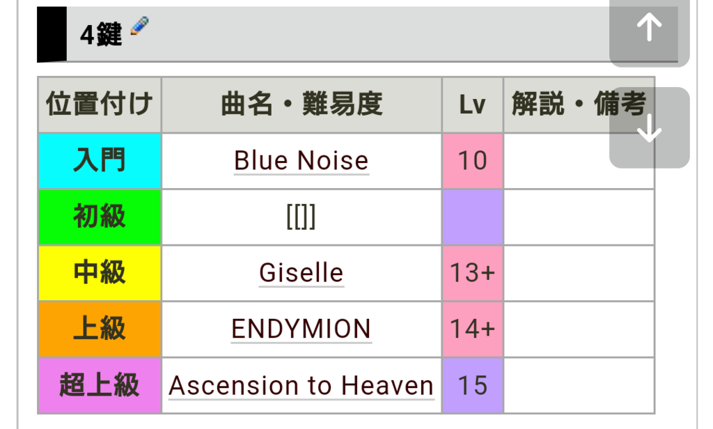 *4鍵 [#y389ee30] |~位置付け|~曲名・難易度|~Lv|LEFT:~解説・備考|h |BGCOLOR(aqua):~入門|CENTER:[[Blue Noise]]|CENTER:BGCOLOR(#ffa0c0):10|| |BGCOLOR(lime):~初級|CENTER:[[]]||CENTER:| |BGCOLOR(yellow):~中級|CENTER:[[Giselle]]|CENTER:BGCOLOR(#ffa0c0):13+|| |CENTER:BGCOLOR(orange):~上級|CENTER:[[ENDYMION]]|CENTER:BGCOLOR(#ffa0c0):14+|| |BGCOLOR(violet):~超上級|CENTER:[[Ascension to Heaven]]|CENTER:BGCOLOR(#c0a0ff):15||