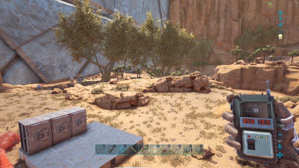 デザートタイタン ・落雷がかなり危険です。落雷は自分にターゲットがきた場合、狙われていること、および何秒後に雷が落ちてくるかが右下のアイコンでわかります。自分が狙われているときづいたらダッシュで逃げてください。また、あまり固まって行動していると他人狙いのものに巻き込まれることもあるので注意してください。 ・グライダースーツやTEKチェストピース持ちであれば、飛行しながら射撃もできますが、そうでない場合は基本地上から空に向かって射撃することになります。ダメージ表記が見えなくても、ヒットマークや当たった時の感触があればダメージ入っているので、気にせず撃ちまくってください。 ・離れすぎているとエングラム解放できないので、ターゲットの体力が減ってきたら飛行しなくてもいいのでなるべく真下付近まできてください。