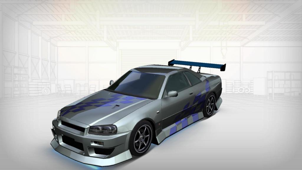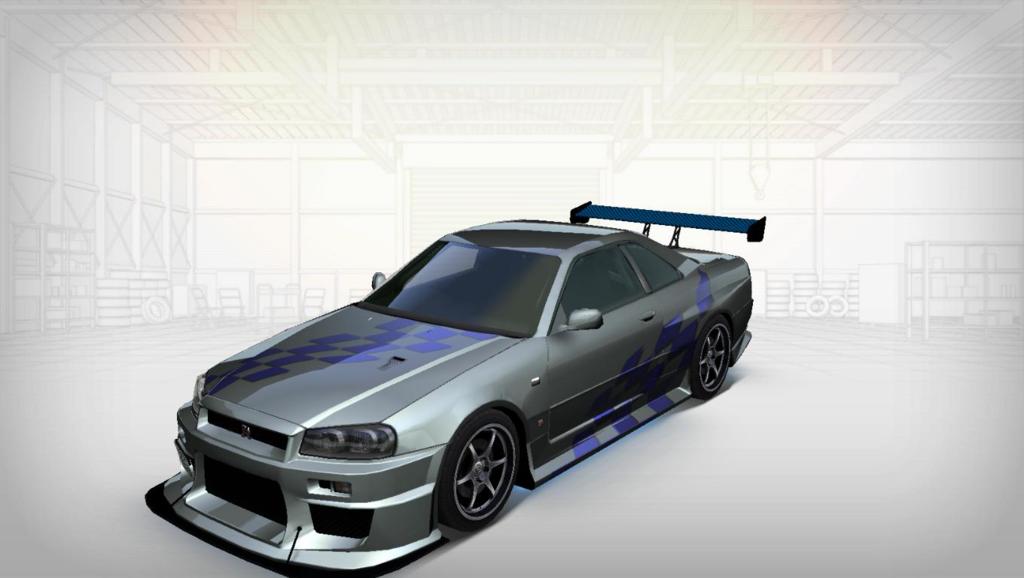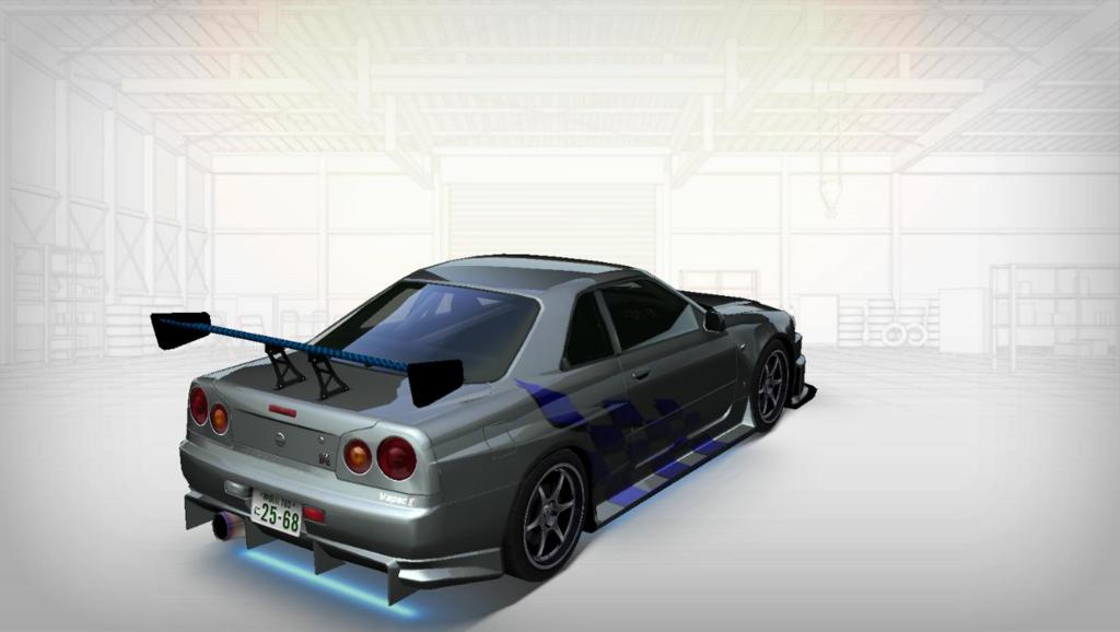BNR34のワイルドスピードX2風仕様です。 組み合わせは、シルバーのボディーカラーに エアロセットD(もしくはE)+YOKOHAMA ADVANRACING RG-D+ ステッカー(チェッカー)+ネオン管(青・ストレート)+ カスタムGTウィングです。