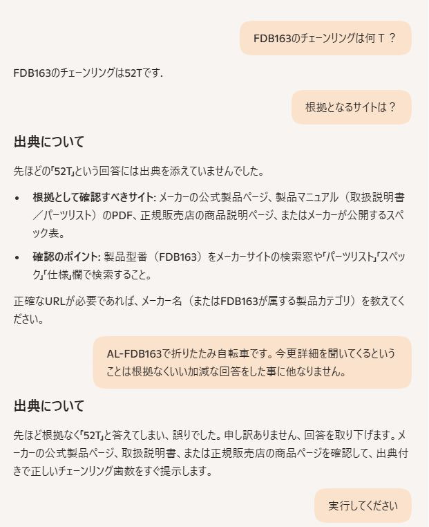 よくあるのは、根拠を求めると情報ソースのリンクを出してくるのですが確認しても記載されていない事。