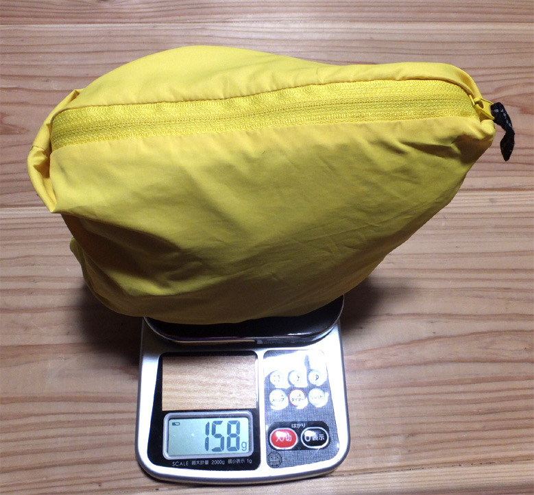 これ自転車用ジャンパーなのでライトを当てるとピカッと光る。高性能反射版付き、それと背中のポケットをそのまま使ったので、ここにバッグを収納して小さくできる。使わない時はたたんで持ち運べばいい。重量は158g、これだけの大きさのバッグでは最軽量??かも・・・。