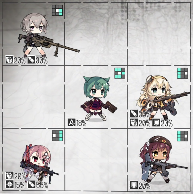 ジェリコを活かした実用的な編成を考えてみたい。陣形とスキルを満たす2MG2SG編成にすると一行空いて使いづらいので、わーちゃんを突っ込んでMGのリロード中火力とSGへの負担軽減をしてもらう。仮想敵はとりあえず装甲敵。長期戦を想定してみる。どうでしょう?あとAA-12以上に噛み合ったSGがいれば意見交換したい。