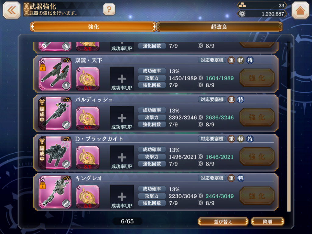 [B設計図からA武器強化最大を目指す場合] ・必要B強化キット数:80=(1+2+…5)+(6+7)x5 ・成功率変化:100→100→86→74→64→(ここからA武器)39→31% ・開発素材数:167=8x(4x3)+13x(3)+32 ※ライジングサンを例にD素材換算 ・設計図:各武器最大攻撃力のB設計図は戦場ドロップする ・超改良素材:C素材5〜7個?(現状では戦場ドロップしない?)