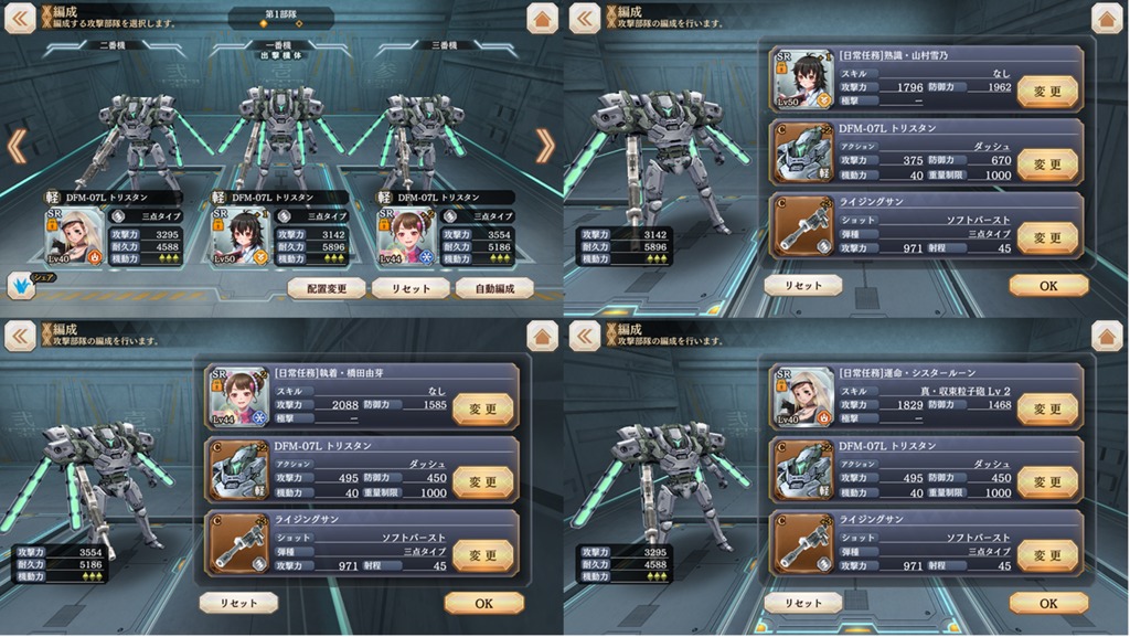 Cトリスタンx3とCライジングサンx3。一機だけ防御力が高いのは、改造x2を防御に入れたので。この編成前は、トリ・ダモ・イシュで混成。攻撃力3000超えるとSランク評価の回数が増えた。