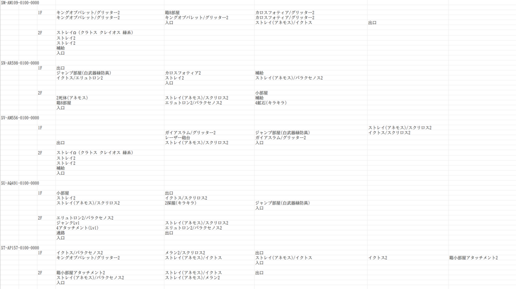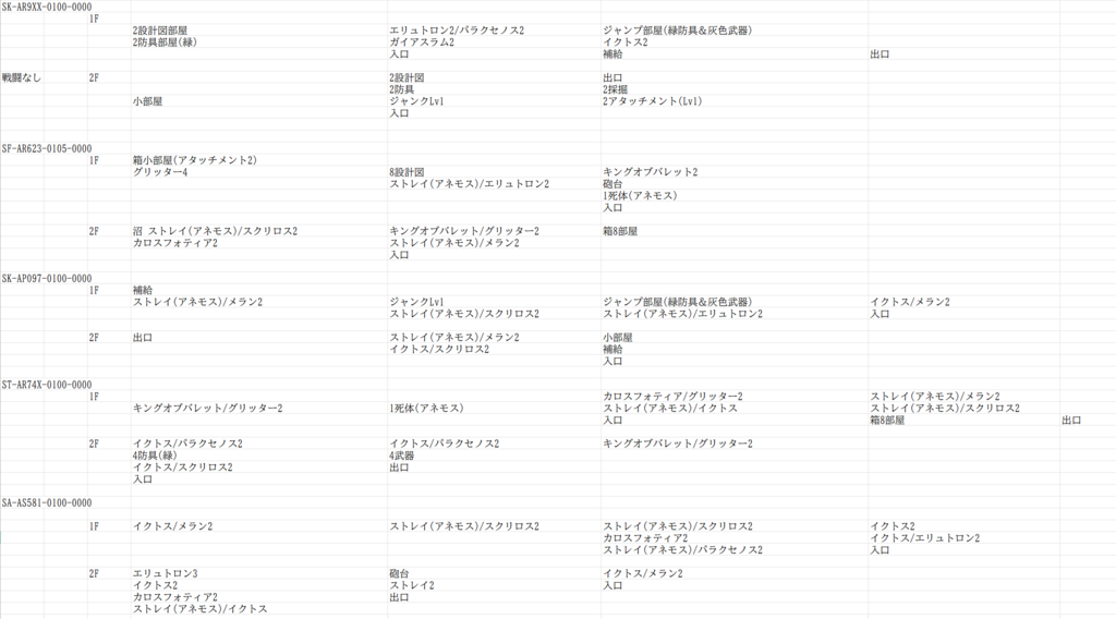 いただいたカードキーのマッピングが完了しました。 現時点でフォージからもらえる最初のカードキーに関して言えることをまとめると (1)4文字目はM~Sくらいの範囲っぽい?( M,P,Q,R,S を確認 ) (2)6文字目7文字目が数字でなくXのカードもある そのカードは戦闘部屋が少なくストレイもいなかったので、フォージカードに数値が入ってるのは戦闘数を補うためかも? (3)ストレイΩフロアがでるカードがある(2枚確認) 深い検証や考察はこれからしていこうと思います、カードをくださった方々本当にありがとうございました。