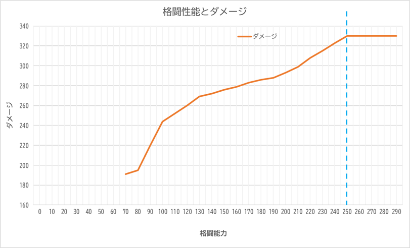 格闘能力とダメージの関係性を調査してみた。使用武器はクラウソラスで熟練度はLv21。ターゲットは訓練所の的の右腕。わかったことは、ダメージ乱数は97%・100%・103%の3種類のみ。そして格闘能力のハードキャップは250であるということがわかった。意外にもダメージの上がり幅が緩いのは130~190くらいなので、近接のダメージを上げたければ格闘を220以上にすべきってところだろうか。