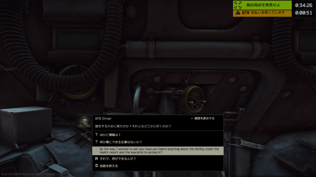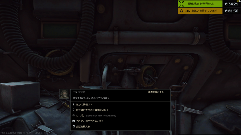 PvE ローカル出撃 ムンシャを渡す選択肢を選びましたが進行せず(”Woods か Streets of Tarkov に行く”だけがチェックマークなし)、手元にムンシャが残った状態でBTRから降りたあとその場に居たScav1体を倒した瞬間クエスト達成になりました