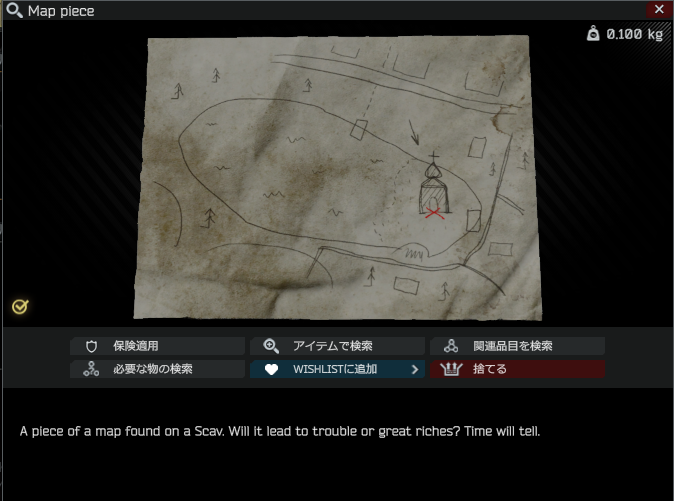 ゲーム内ヒントとして、Map(Map piece)が追加されているようです。当該タスクはWoodsですが、LighthouseのScavが所持していました。