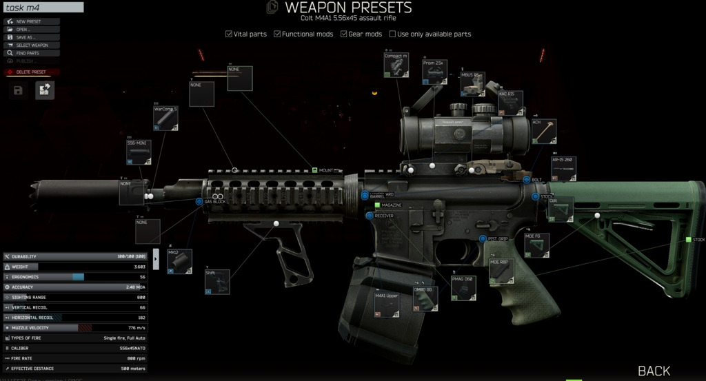 Gunsmith Part4のM4は関連アタッチメントの性能が大きく変わっているため、例示されてる仕様ではクリアできない。とりあえず追究したところではキャリハン外してストックはEMOD、Cobraフォアグリップにすれば達成できる。恐らくリコイルとエルゴノミクス周りでだいぶ前期から変更されたんだろう。
