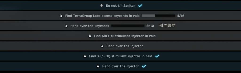 サニターを倒してイエーガータスクの方をクリアしましたが、このタスクが残り続けています。イエーガーのタスクは完了もしましたし報酬ももらいました。何回か再起動もしましたが失敗判定にはなりません。試しにタスク内容である注射器を一本納品しましたが普通に納品出来て1項目クリアしました。バグでしょうか?