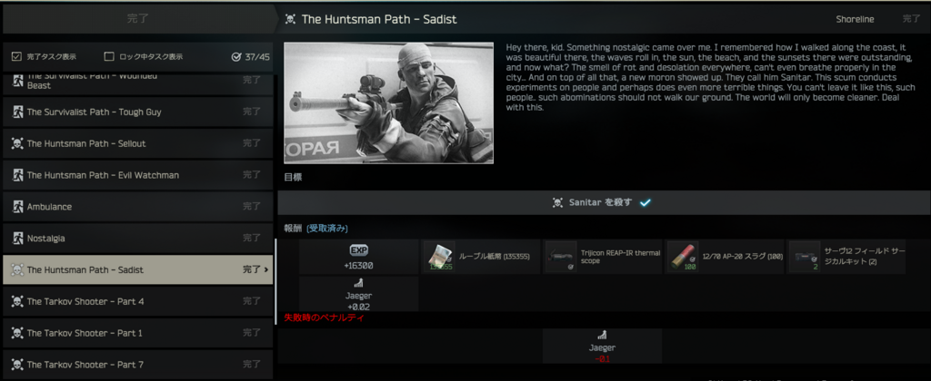 横からですがキャラクター画面のタスク欄にはサディストタスクが残っていましたが、トレーダータブのイェーガータスクを開くと失敗になりタスクが消えました。