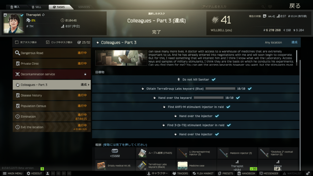 報酬のVioletがBlackに変更だそうです。一応報酬確認できたものはブラックカードキー、Meds case、L1x3、Meldnin x3、オブドロ2x5、グリズリーx4