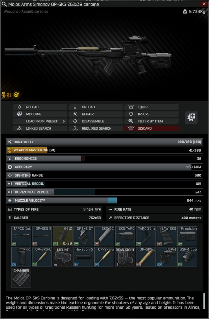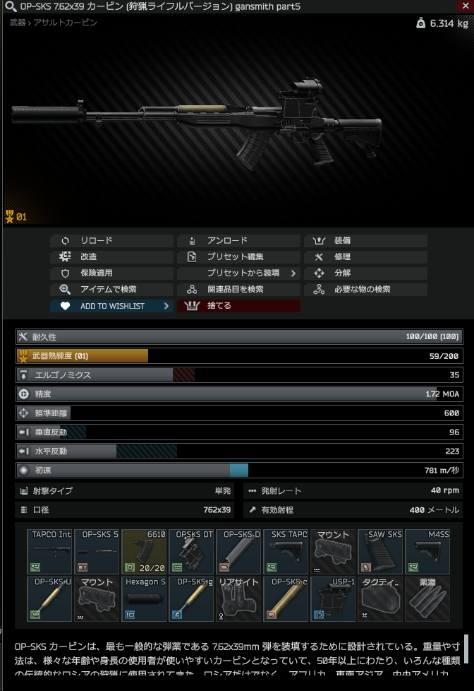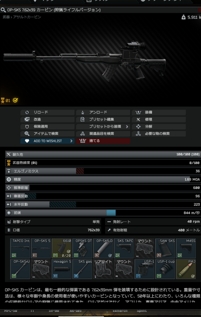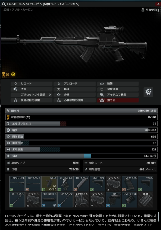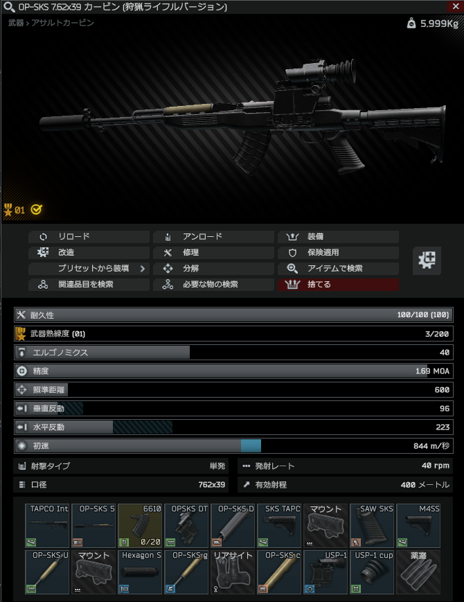 wiki記載の品を順に買い、リアサイト外し+NPZ USP-1 scope eyecupを取り付けずにエルゴ35になって納品できたのでスクショ残しておきます。1枚目がNPZ USP-1 scope eyecupを取り付けないパターン、2枚目が取り付けたパターン。OP-SKS gas tube coverを付けたままならエルゴ+4が無くならないため、NPZ USP-1 scope eyecupのエルゴ+5が不要なようです。