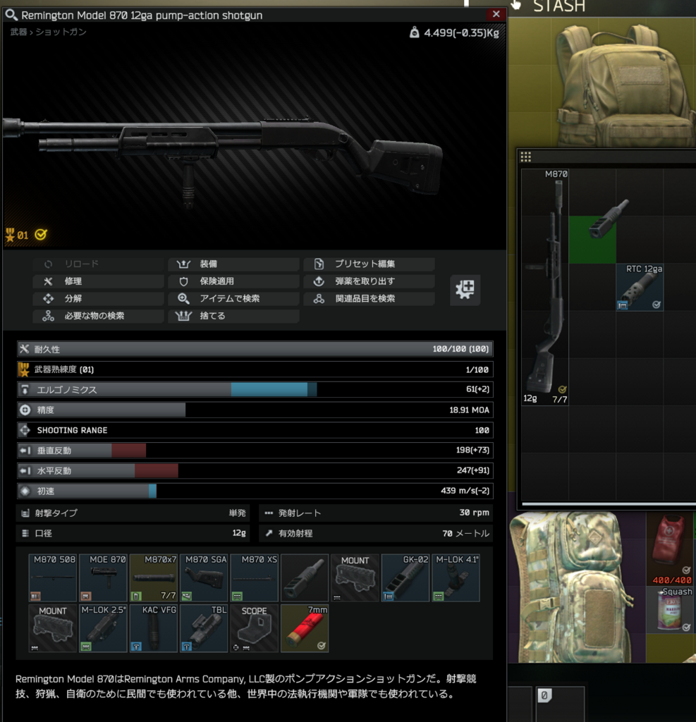 カバー付きフロントアイアンサイトの「508mm barrel with a fixed sight」があり、こちらにはつけられません。つけられるのは「M870 12ga 508mm barrel」デフォルト構成にはないのでSCAV産か何かですかね?