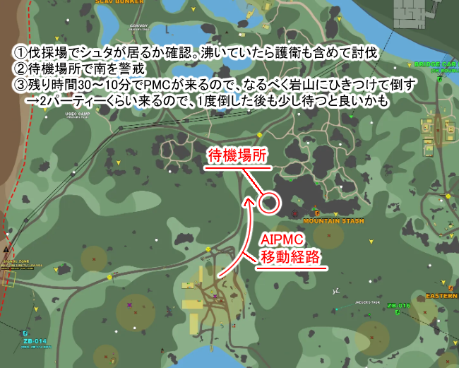 上の人が教えてくれたトランジット込のやり方で1レイド目で2人キルできたんだけど、それ以降何回やっても山湧きPMCがいない…山上で待つよりは間違いなく周回効率良いからこれやるしかないんだけどマジでWoodsのAIPMCのルート変えて欲しいよ運営さん