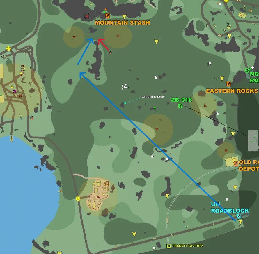 Factoryからトランジットすればunroadblockで確定湧きするので、あとはsj6刺して画像の青ルートで移動、 赤ルートのAIPMCを狩ってFactoryにトランジットを繰り返せば結構楽に終わりました 38分前半に岩の間に到着、37分までにPMCが来なければFactoryに向かうチャートです