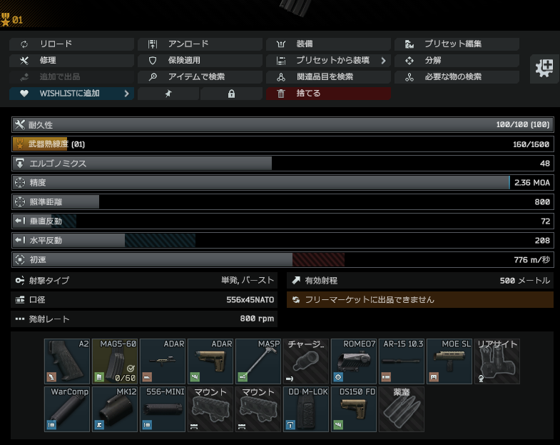 バードアイのM4(your-ex)をマガジンを60連にして光学を照準距離800(トレーダーだとロメオ7とか)にするだけで納品できるのでタイミングよく手に入ったりすると楽ちんです。