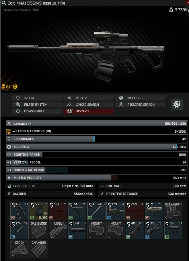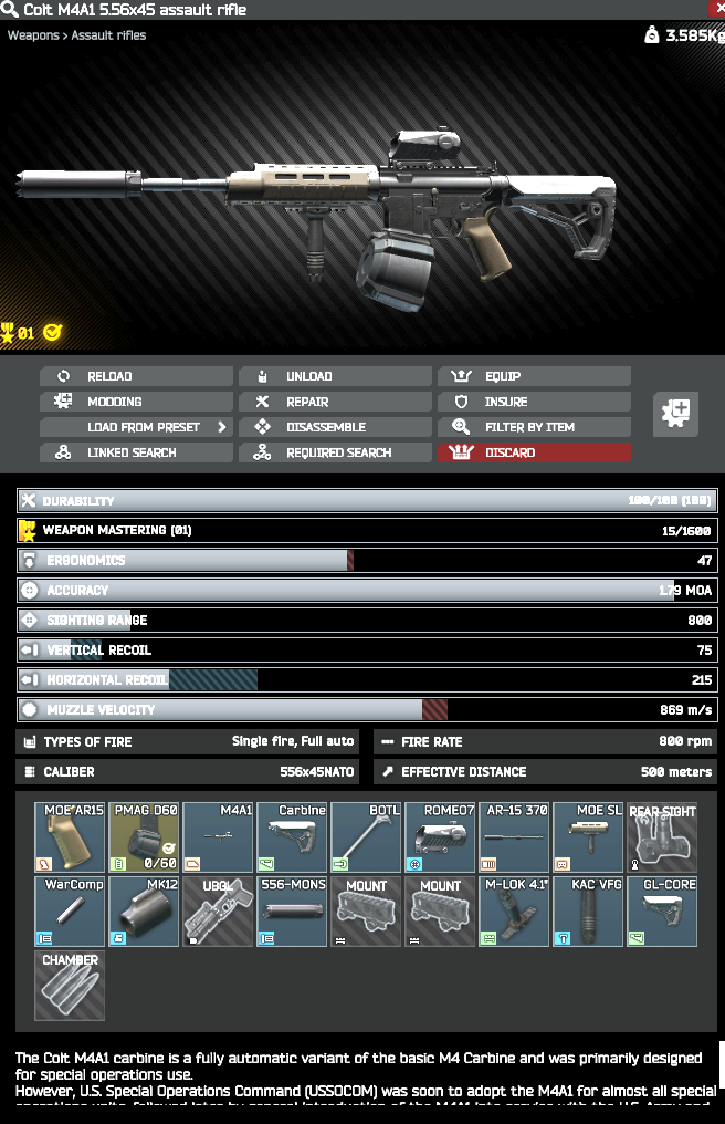 あとはデフォルトでついてるColt Carbine buffer tube(反動1%減)に一番安いストックのM4SS(-19%)をつけるだけで、反動は77+222=299 と、ぎりぎり反動の数値を満たすことができます。