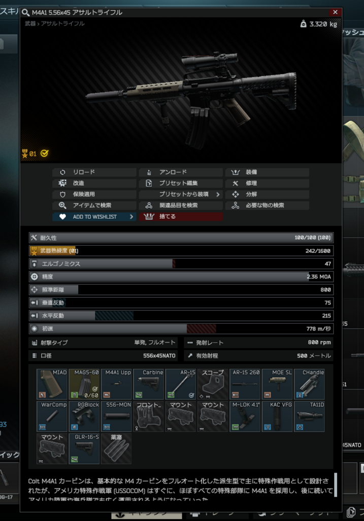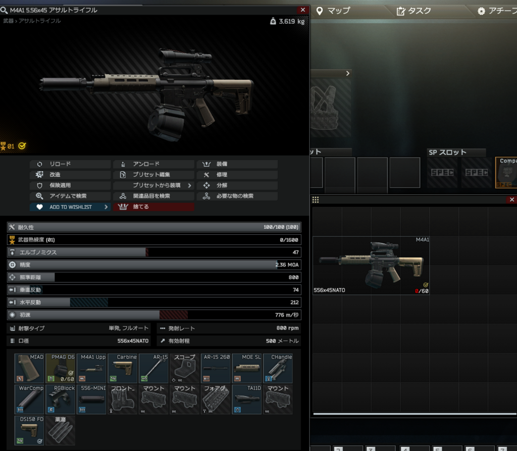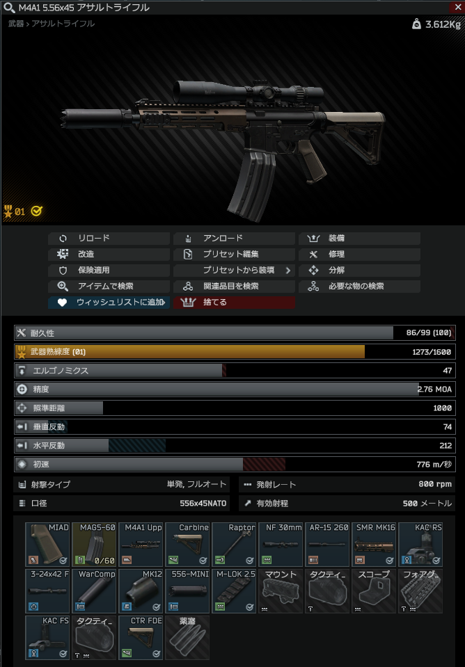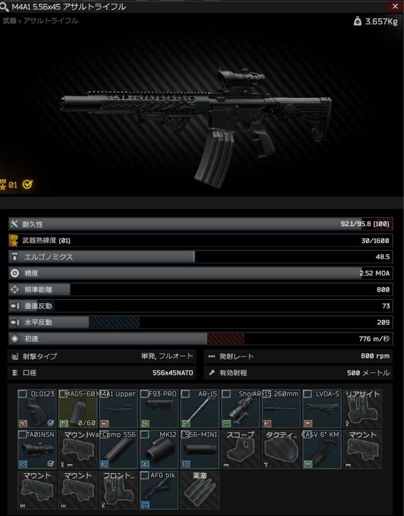 あとは「エルゴノミクス値47以上」「反動が300未満」「照準距離が800以上」が満たされれば納品が出来るので、「サイトはこれじゃないとダメ!」とか「フォアグリップはこれじゃないとダメ」ってことはありません。トータルで上記の性能に収まれば納品が出来るはずです。