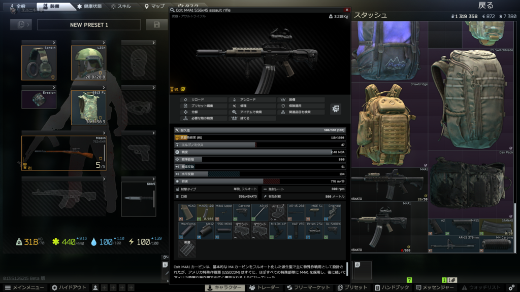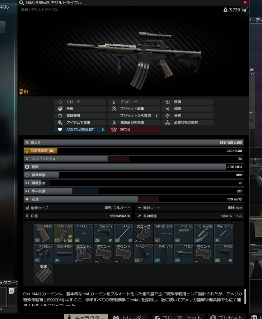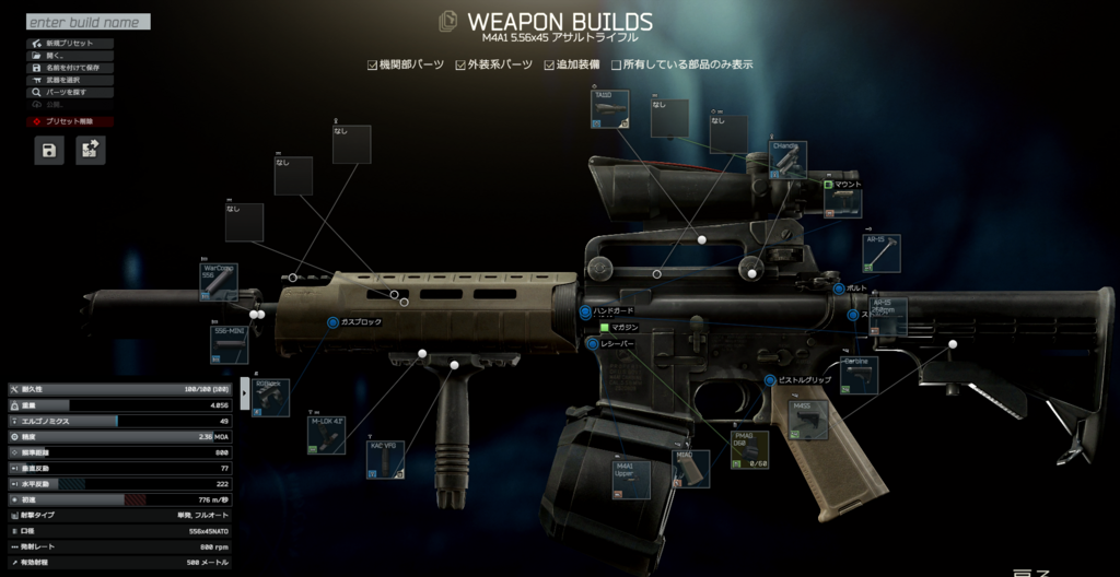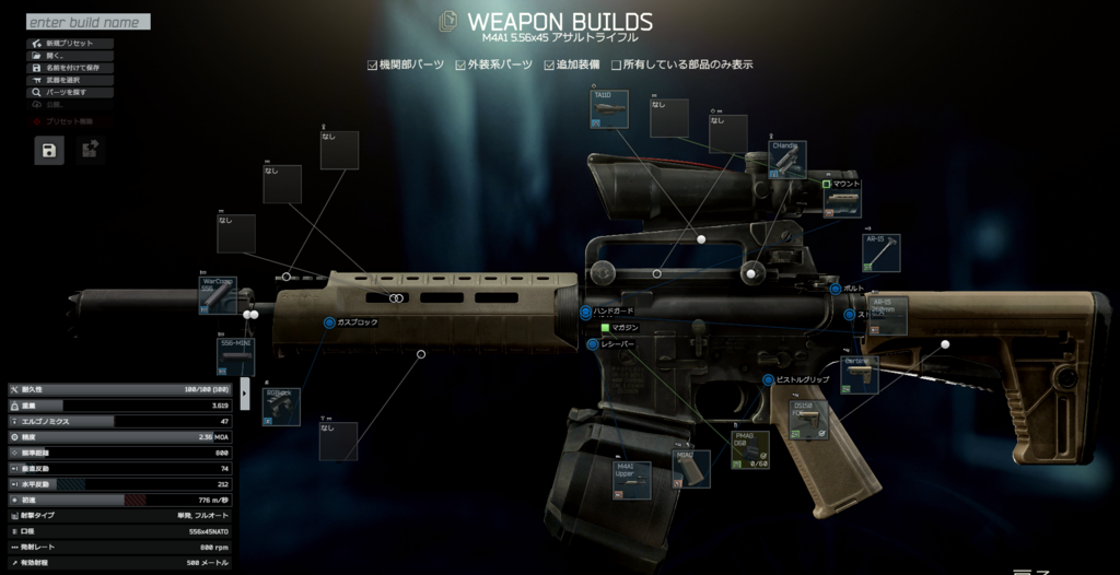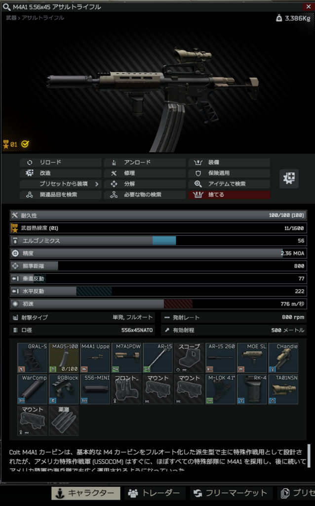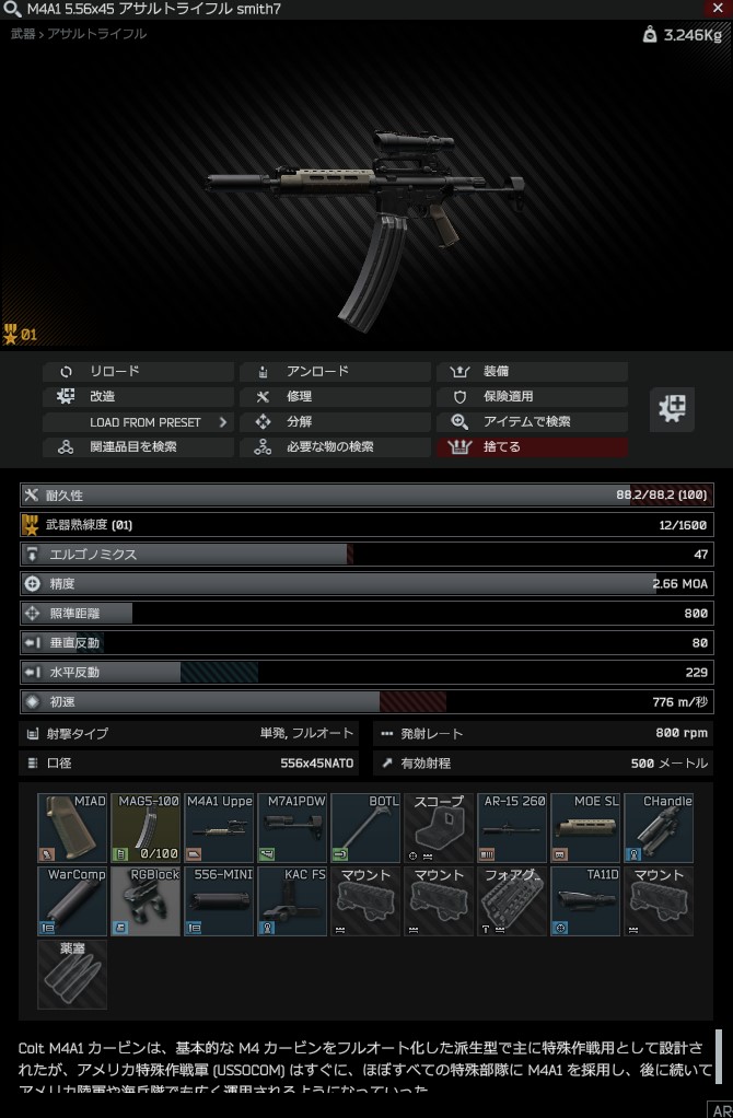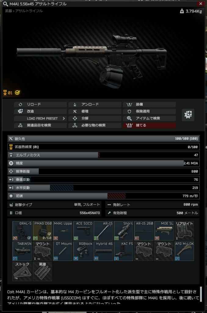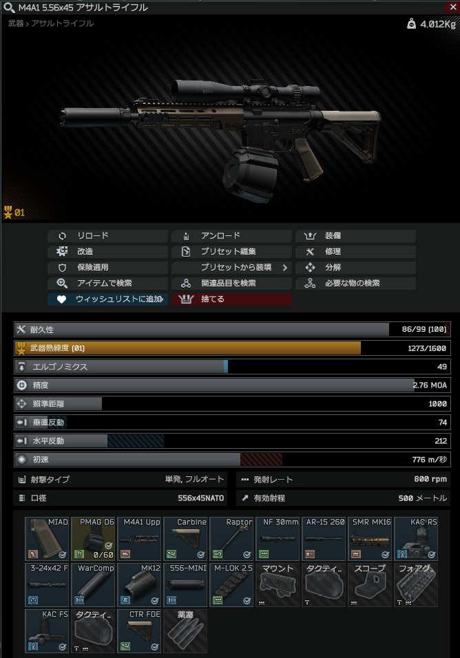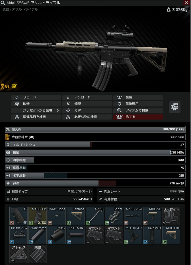 現状の日本語wikiと同じカスタマイズで、マガジンをこっちにすると重量がオーバー(4.056kg)してしまいます。
