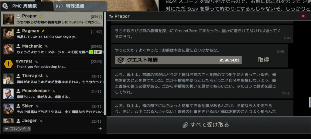pve製品版ワイプ済みレベル18でタスク出ました。グレネーダーも終わってないです。