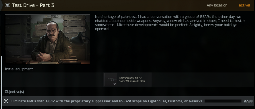 PvEです。冬MAPのアプデ後にタスクの文言が「LighthouseでサプレッサーとValday PS-320 1/6x スコープを装着したAK-12でPMCをキルする」に変わっていました。