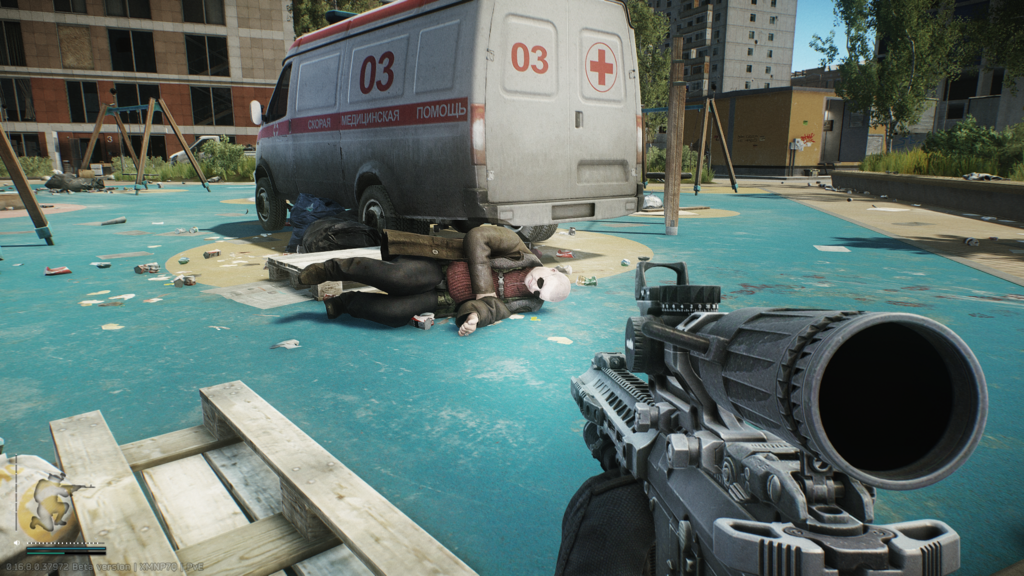 PVEでPスカ、初期装備が特にインベントリが腐ってたりするときに、KABANがいなければこの周辺NPCPMCがたむろってて美味しいので行ってみた。 始まってすぐ銃声していたので、KABANいるかなと警戒しつつ侵入。銃座全部にモブが立っていたが誰も撃ってこず反応もせず。 2階建て建物1階で狂ったようにドアを蹴り開けては締めている奴らがこっちを威嚇してきたので、チラチラ見て撃ってくるのを確認。 それでも護衛の可能性を捨てきれず、かつ彼らが外に出てきて銃座の前に立っても全く銃座の面々反応せずで、本当にギリギリまでから殺傷。 漁ったらNPCPMC・・・。銃座メンツ何やってん・・・。 付近の死体からM60出てきたので多分KABAN。バグですかね? あとその死体からBasement Descentへのパスコード出ました。