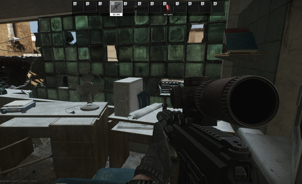 壁の崩れた外に繋がる穴のある部屋の、崩れた壁側にあるパソコンの横にありました。デスクトップに立てかけてあり、椅子が邪魔で見つけずらくなっています。椅子に飛び乗ってパソコンに相対すると見つけやすいかと思います。