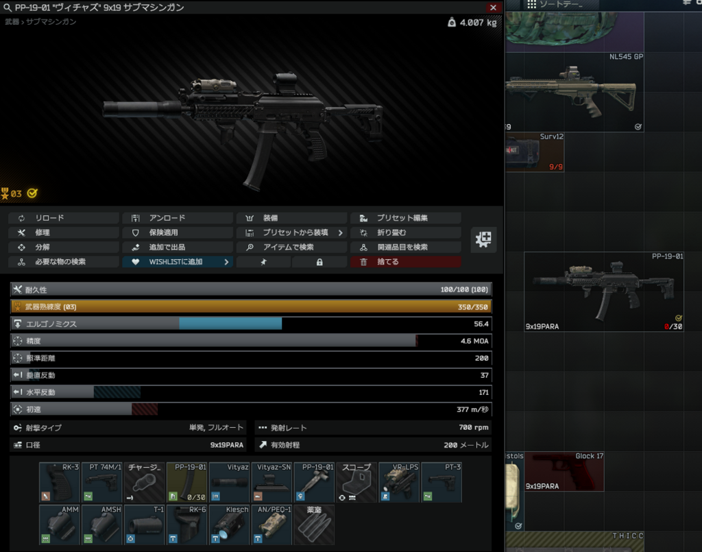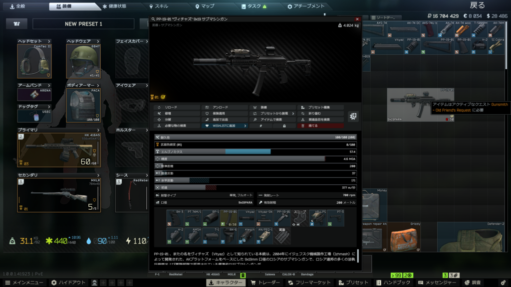 ヴィチャズに使用するピストルグリップ(AK Zenit RK-3 pistol grip)の入手が難しい場合は、RefのLL1にてGPコイン41枚で「PP-19-01 Zenit」が交換できるので、そちらを交換してカスタムすると安上がりになるかも