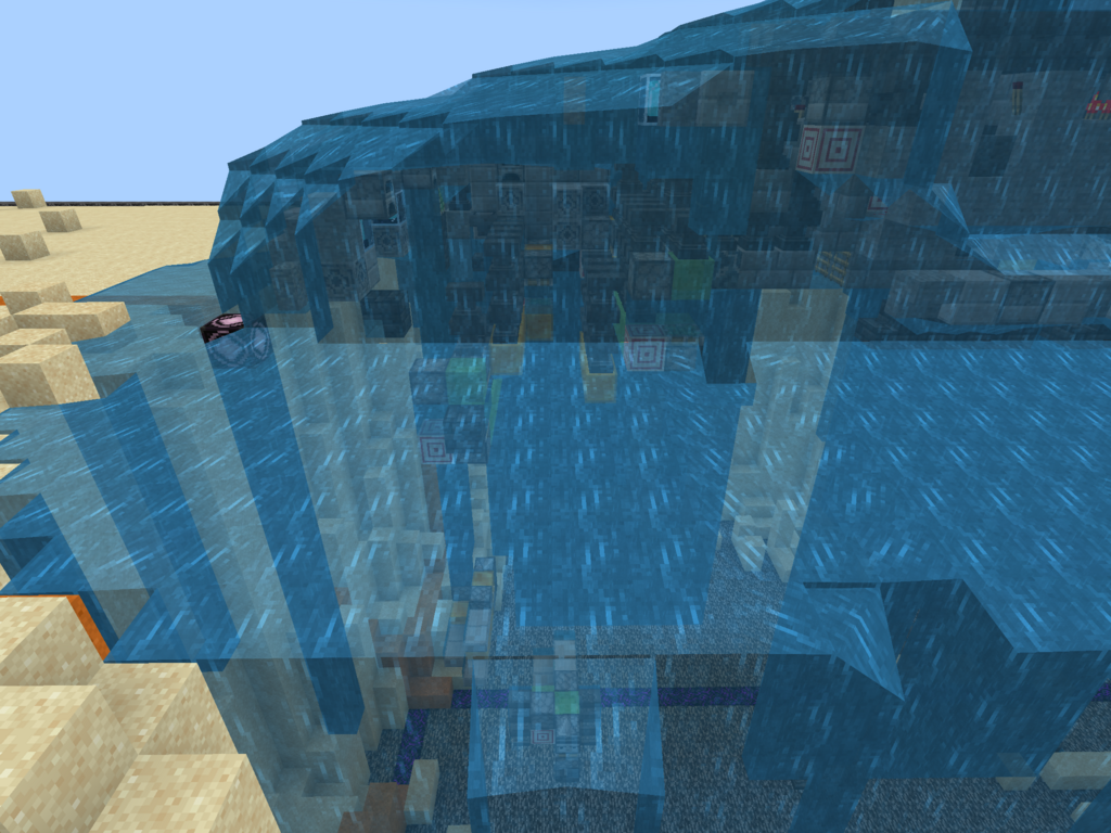 装甲はアプデ後の環境としては珍しいアンカー装甲を採用しています。最近のアプデによってディスから排出したシュル箱が水中でもブロックとして置かれる仕様になった為、最近はシュル箱再生倫理が多く使われているのですが、再生倫理関係の技術が乏しい為アンカーを採用しています。ただこのアンカー、非常に優秀な物となっており、縦11bの所に分離用含め6機が搭載されており、密度が物凄いです。それに加え一層目と二層目でアンカーが切れており、最下段を崩してしまえば後はドミノ倒しのように全て破壊されるのを防止しています。手前のアンカーは最高高度が3ラインの為、射撃の妨げにもなりません。そして強調されている押し上げ式金床砲閉鎖ですが、抜き取った物がこちらです。