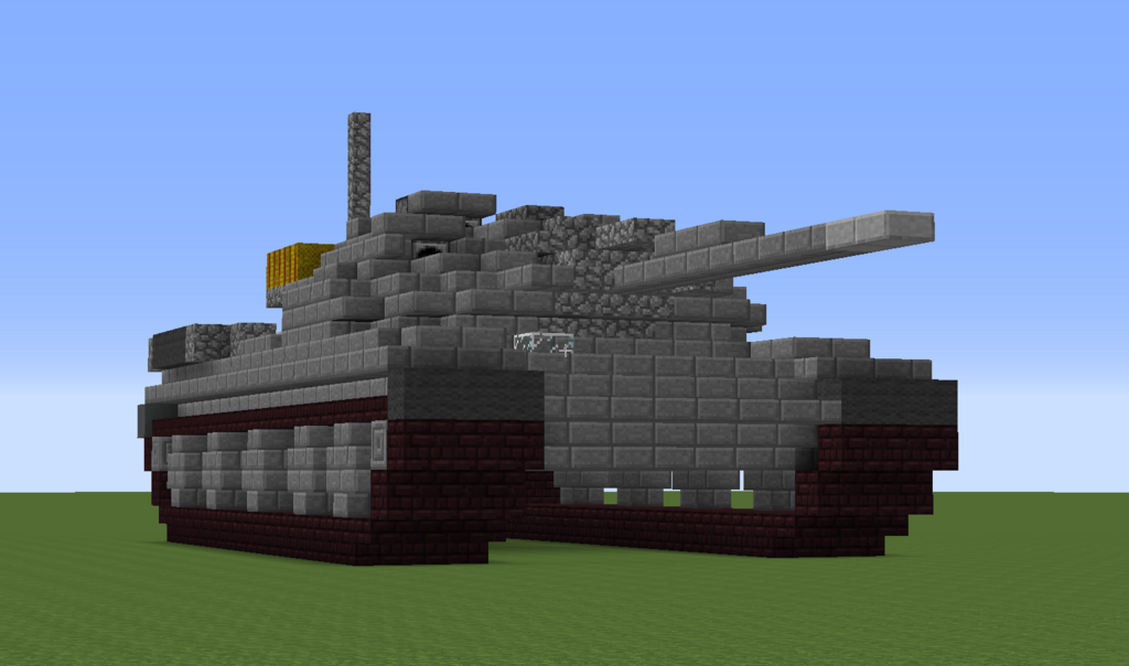 こちらは私が開発した金床砲閉鎖で、名前も勝手に自分で「押し上げ式」としています。由来はピストンによって砲閉鎖ブロックであるフェンスゲートが押し上げられているところからです。この砲閉鎖の利点として、回路が単純と言うところがあります。これまでの金床砲閉鎖はピストンを引っ込ませ、金床が落下して当たり判定がない間に射撃を済ませると言う仕組みでした。ですがこの砲閉鎖は手前の金床を下げ、フェンスゲートを押し上げるだけの為、言ってしまえば射撃が終わるまでにこの動作が完了していれば良い訳です。その為何処からでも配線を引っ張って来れる為、制作難易度が低くなっています。実際この戦車も砂ピストンタイミングのホッパーから出力を取っています。そしてもう一つ利点があり、射撃時の制約が少ないと言う事です。これまでの金床砲閉鎖はその構造上、装薬を増やし過ぎると金床が吹っ飛んでしまう、と言う欠点がありました。ただこれは先ほども言った通り、落下中に撃つものではない為そんな制約もありません。燃費機構に関しても、従来型とほとんど変わりなく使用可能です。