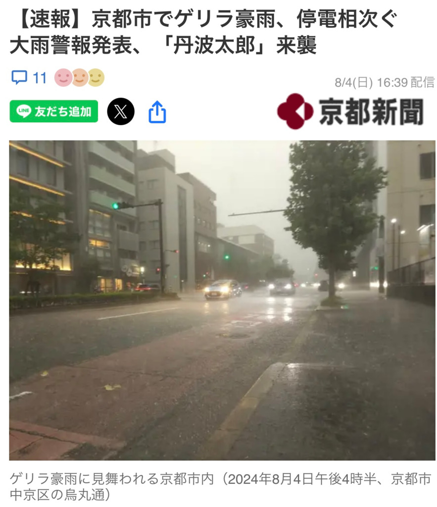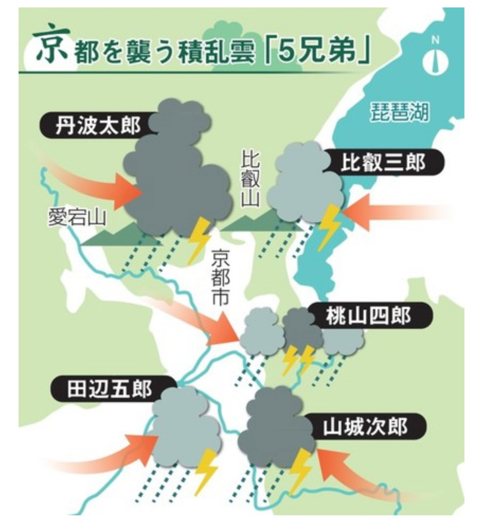 気象台によると、4日からは京都府上空に湿った空気が流れ込んでおり、今後1週間程度は、京都市で古くから「丹波太郎」「山城次郎」などと呼ばれる激しい夕立の恐れが続くという。