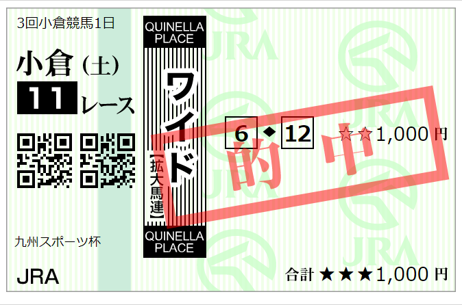 馬連(1軸)⑨-⑫⑮①⑬⑤