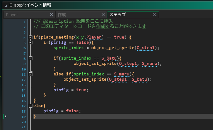 全体の作りがわからない部分があるので的外れになるかもしれませんが、 オブジェクトO_step1がroom内に複数配置されていて、 playerオブジェクトがそれを踏むと✘が◯に、◯が✘に変わる(spriteが変わる) という前提で考えてみます。