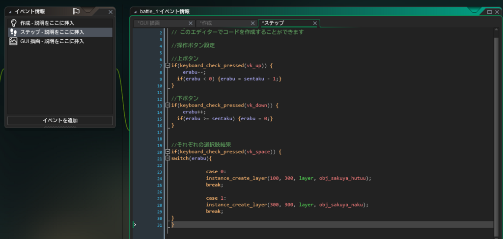 if(keyboard_check_pressed(vk_up)) { erabu--; if(erabu < 0) {erabu = 0} show_debug_message($"erabu={erabu},sentaku={sentaku}"); } //下ボタン if(keyboard_check_pressed(vk_down)) { erabu++; if(erabu >= sentaku) {erabu = 2;} show_debug_message($"erabu={erabu},sentaku={sentaku}"); } //それぞれの選択肢結果 if(keyboard_check_pressed(vk_space)) { switch(erabu){ case 0: show_debug_message($"selected 0"); instance_create_layer(100, 300, layer, obj_sakuya_hutuu); break; case 1: show_debug_message($"selected 1"); instance_create_layer(300, 300, layer, obj_sakuya_naku); break; case 2: show_debug_message($"selected 2"); instance_create_layer(500, 300, layer, obj_sakuya_warau); break; } }