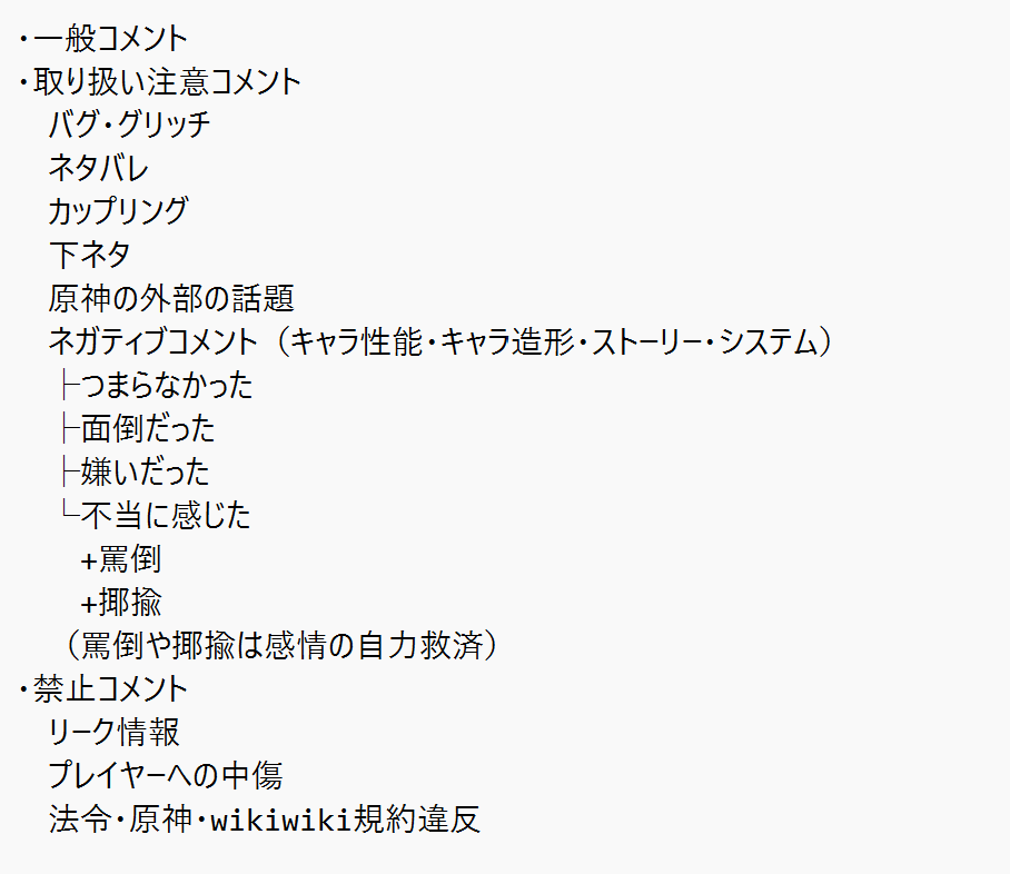 これで網羅できているかは不明ですが、挙げられている6点については、なぜ禁止されているのか(されていないのか)、どの程度禁止されているのか、回避方法はあるのかなどを今よりも明確化することが可能です。先述した通り、これだけで全てのコメントを区分することは難しいですが、ルールの安定化には貢献できると考えています。